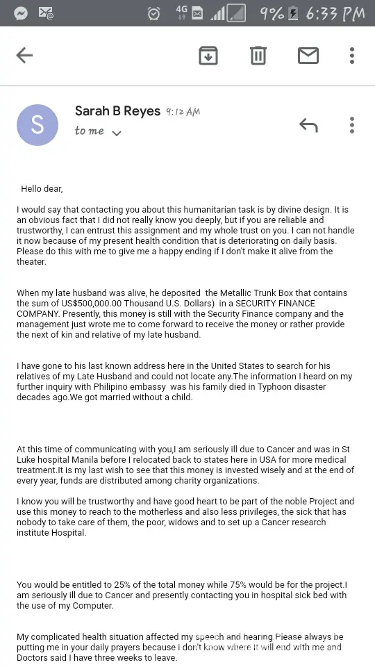 someone sent me an email saying that i wil receive a money using trunk box and found out it's a scam. I hereby ask for your assistance with regards with this scam.