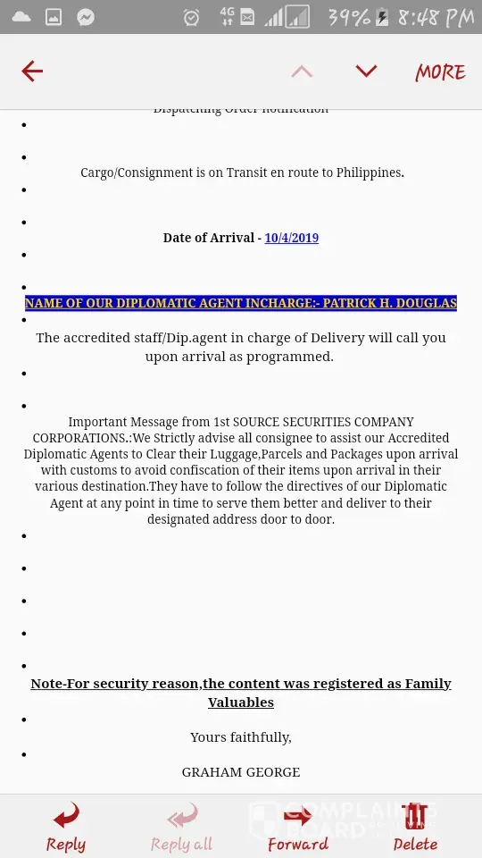 i received an email from a person in EU who had terminal cancer, asking me to disseminate $50 million to charity, 25% will be mine. asked for my address and phone. he provided receipt to validate what he's going to send me and directed me to this website to track the package http://worldwesternglobalcourier.com/. Somewhere between our email exchange he used a company named imperial global courier or the word imperial that is who i got here in the first place and found out that this was a scam. when i checked in whois.com. i found out this website http://worldwesternglobalcourier.com was created just first week of sept 2019. the website is very new. days later i received a text asking me to pay for 15k to receive this trunk from the airport. do not entertain this person. they are usually preying on jobseekers in Linkedin. report the email and website to google. by the way i replied back and told them i am no longer going to pick up that package. she got furious and threaten to sue me. then i received a message saying that the package haa arrived and that i should pay for it. if its too good to be true, google search everything, the websites, the names, the company that will be mentioned on the email, if it doesnt exist or if its a totally new website... its a scam