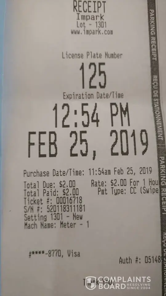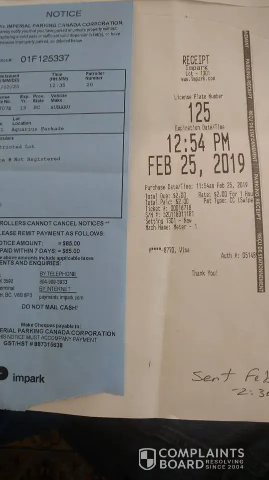 As can been seen from the attached documents, I have paid for my parking and have indicated the stall number which is also shown on Impark Parking ticket.