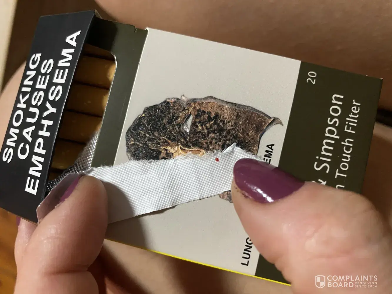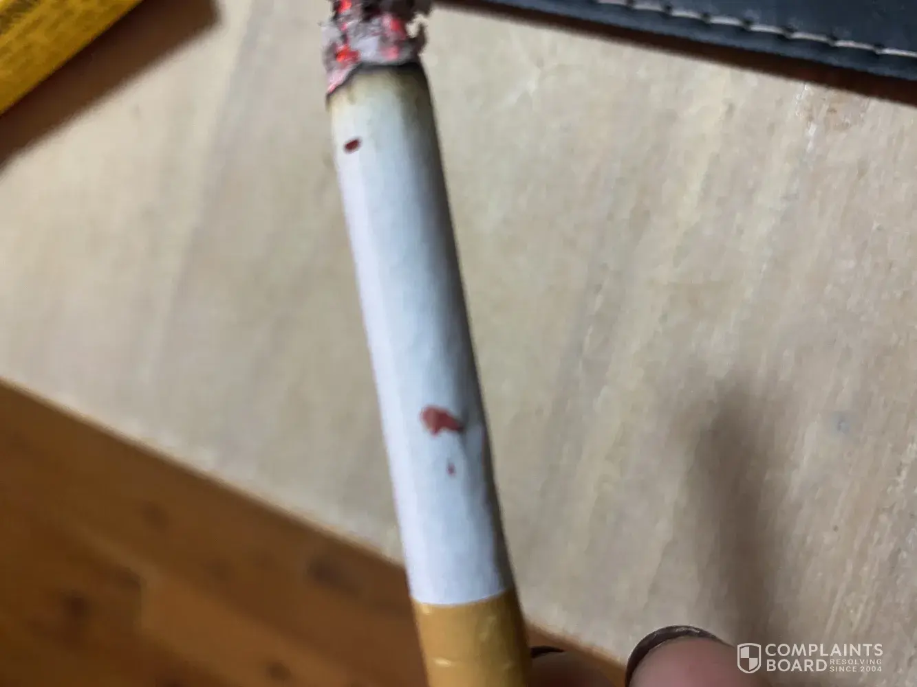I purchased a pack of Parker and Simpson blue 20s and a few of the smokes and the inside of the package had blood in them. I've thrown out the entire packet because it's hugely unsafe