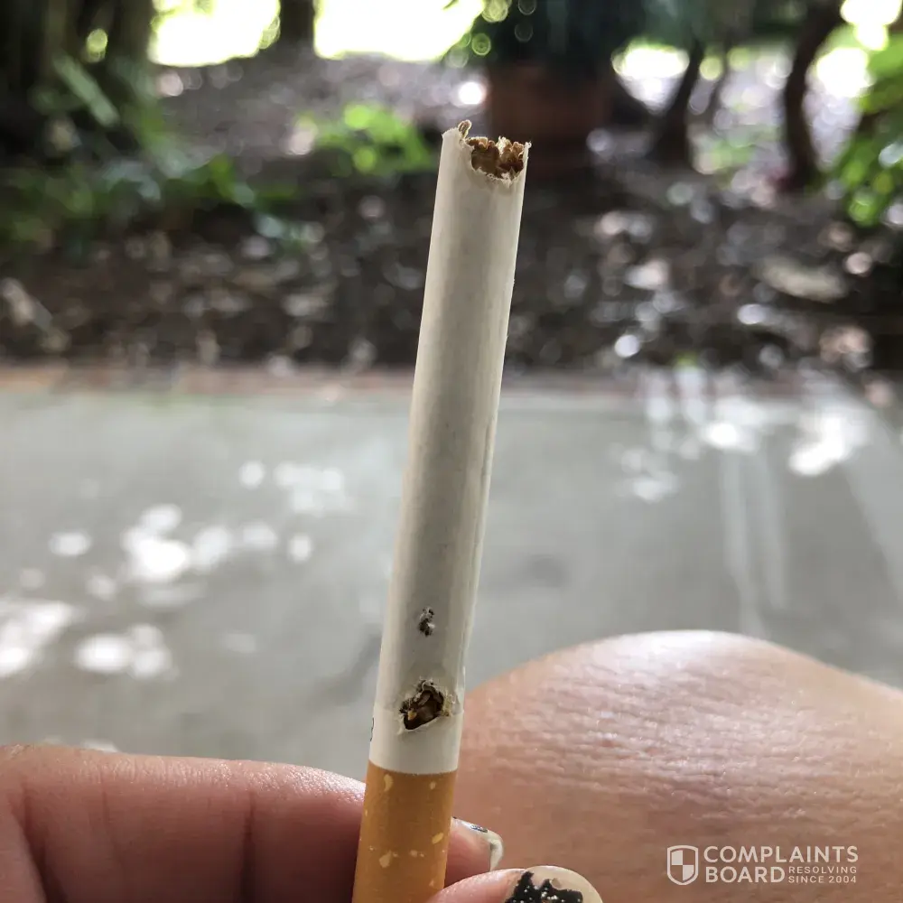Opened a packet of cigarettes to find a cigarette with holes in the paper and the end was missing a big chunk also the filter end of the cigarette had a hole making it impossible to smoke. I've never had a problem with this brand but this is disappointing. Considering we are in the midst of a global pandemic I am reluctant to leave my house and purchase more. Your attention to this matter would be greatly appreciated. Thank you