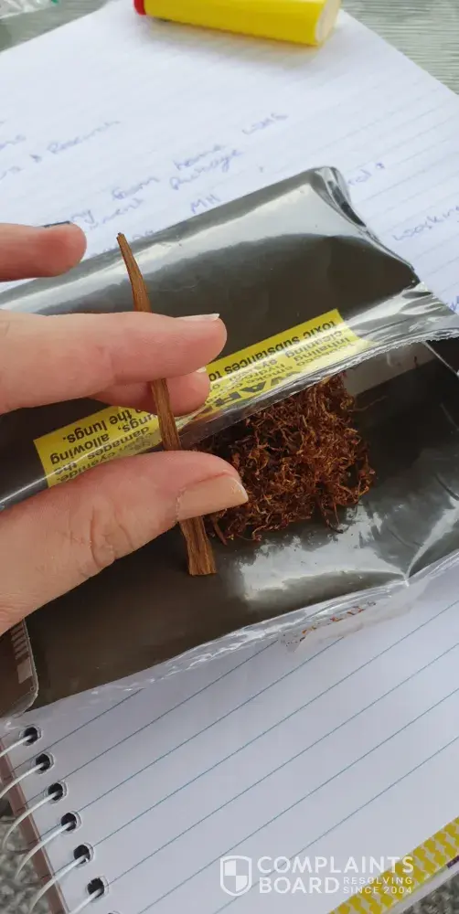 A 7cm piece of bark was found in my pouch. I have attached photos of this. Todays date: 8 April 2020 I would like you to be aware of the issue with this batch as this is a rather large chunk and i had similar smaller chunks in my previous pouch. It concerns me that we are paying for a specific weight of tobacco and not receiving this weight from your company due to these additions.