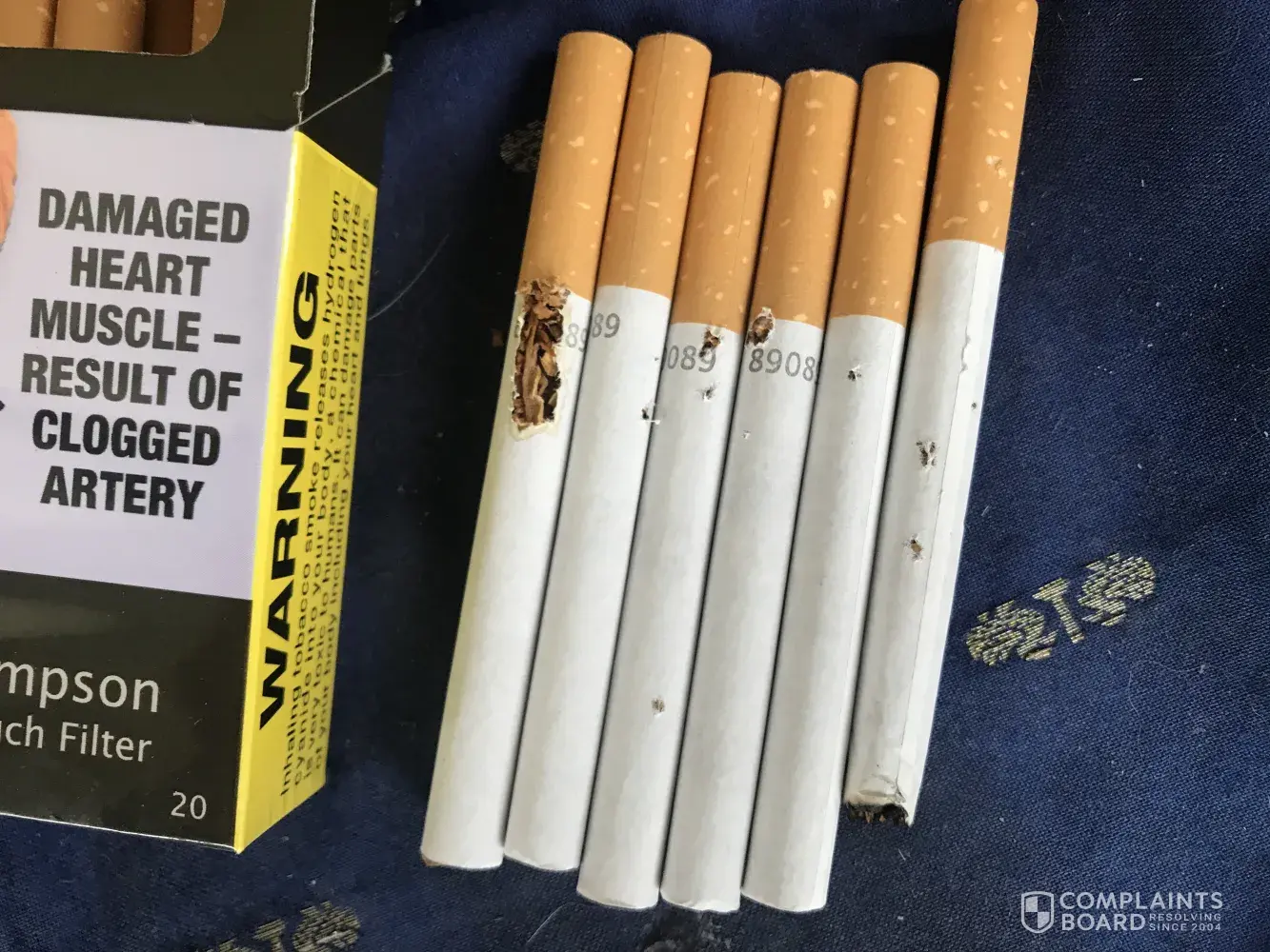 Hello I bought this packet of cigarettes and I've attached photos of the damaged cigarettes that make it impossible to smoke normally. The first few times I just figured one in the odd here and then but now it's more often and more in each packet. I look forward to hearing from you soon to resolve this situation that keeps repeating. Thanks for your time.