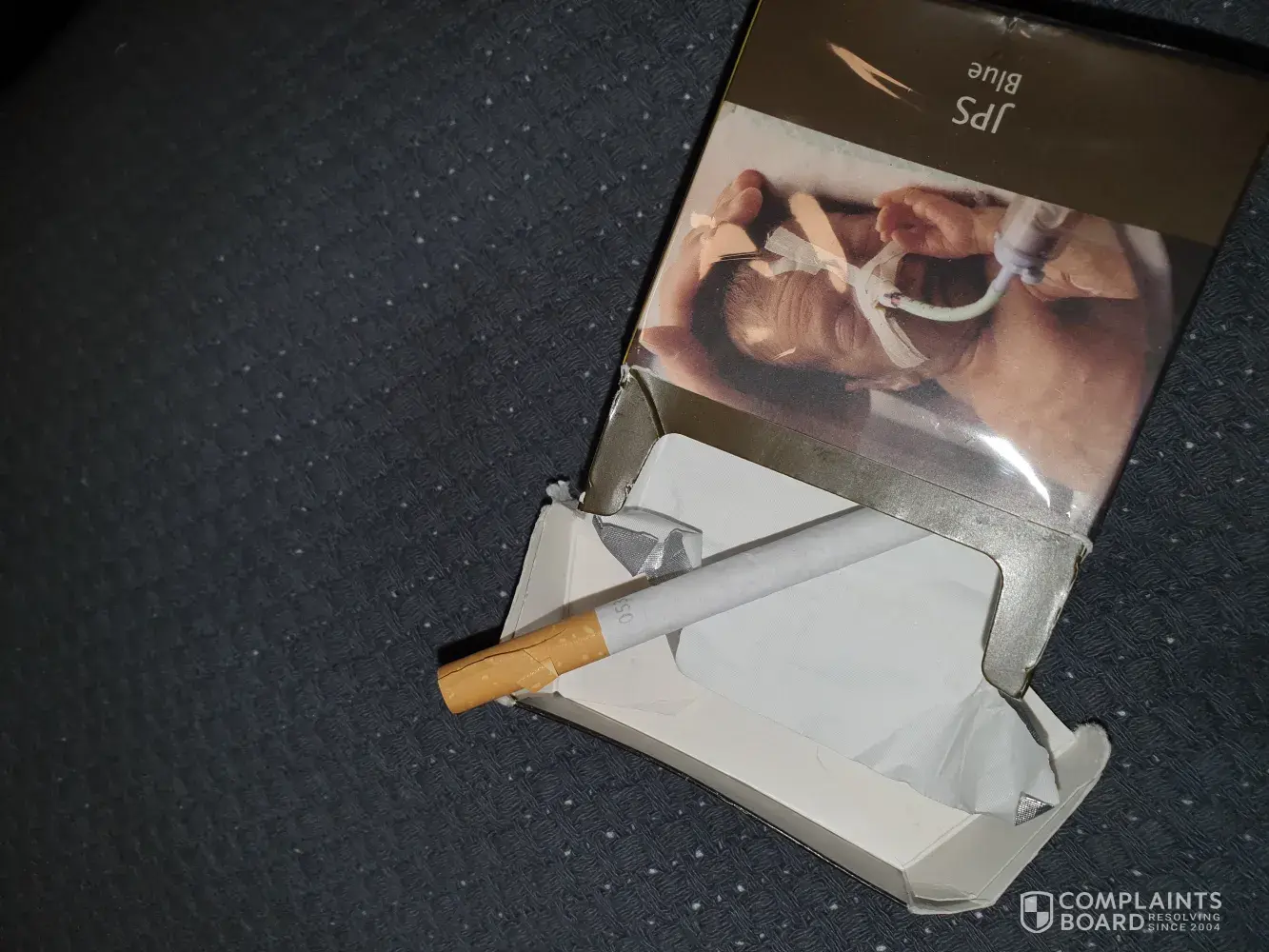 I bought a carton of jps blue 40 and opened the packet to find 1 of the cigarette filter is mangled - I took pictures of the cigarette and the barcode of the packet it came out of. I was a bit disappointed as I changed my smokes to jps blues and have been quite happy with them except this is the 1st one that I have found, I work all over nsw and to find this was a surprise.