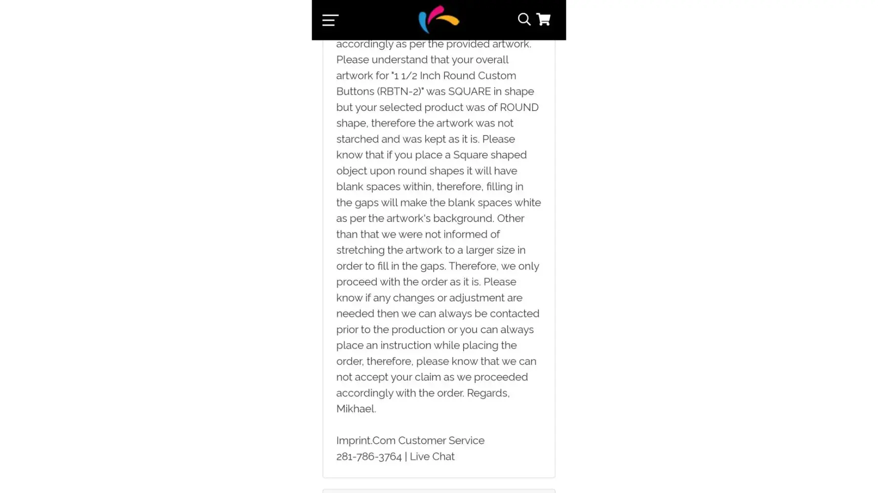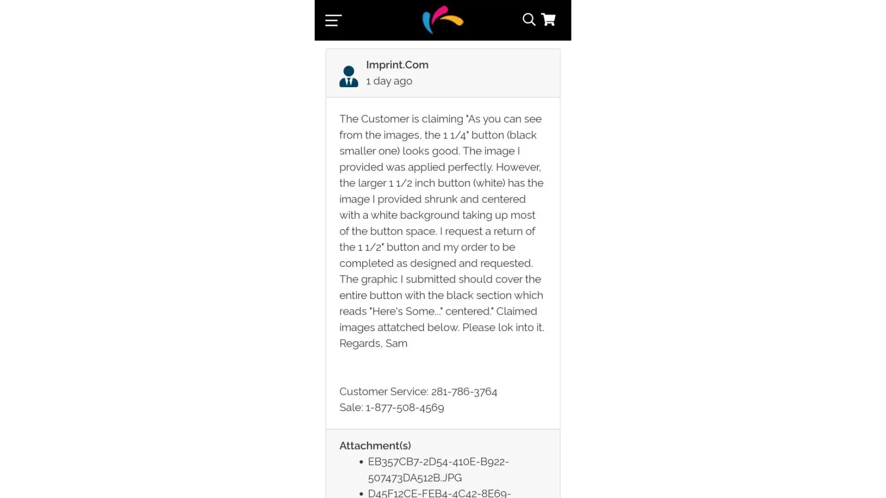 In conclusion, if you or anyone is ever shopping for custom buttons, DO NOT USE IMPRINT.COM. Thank you for your time and attention.