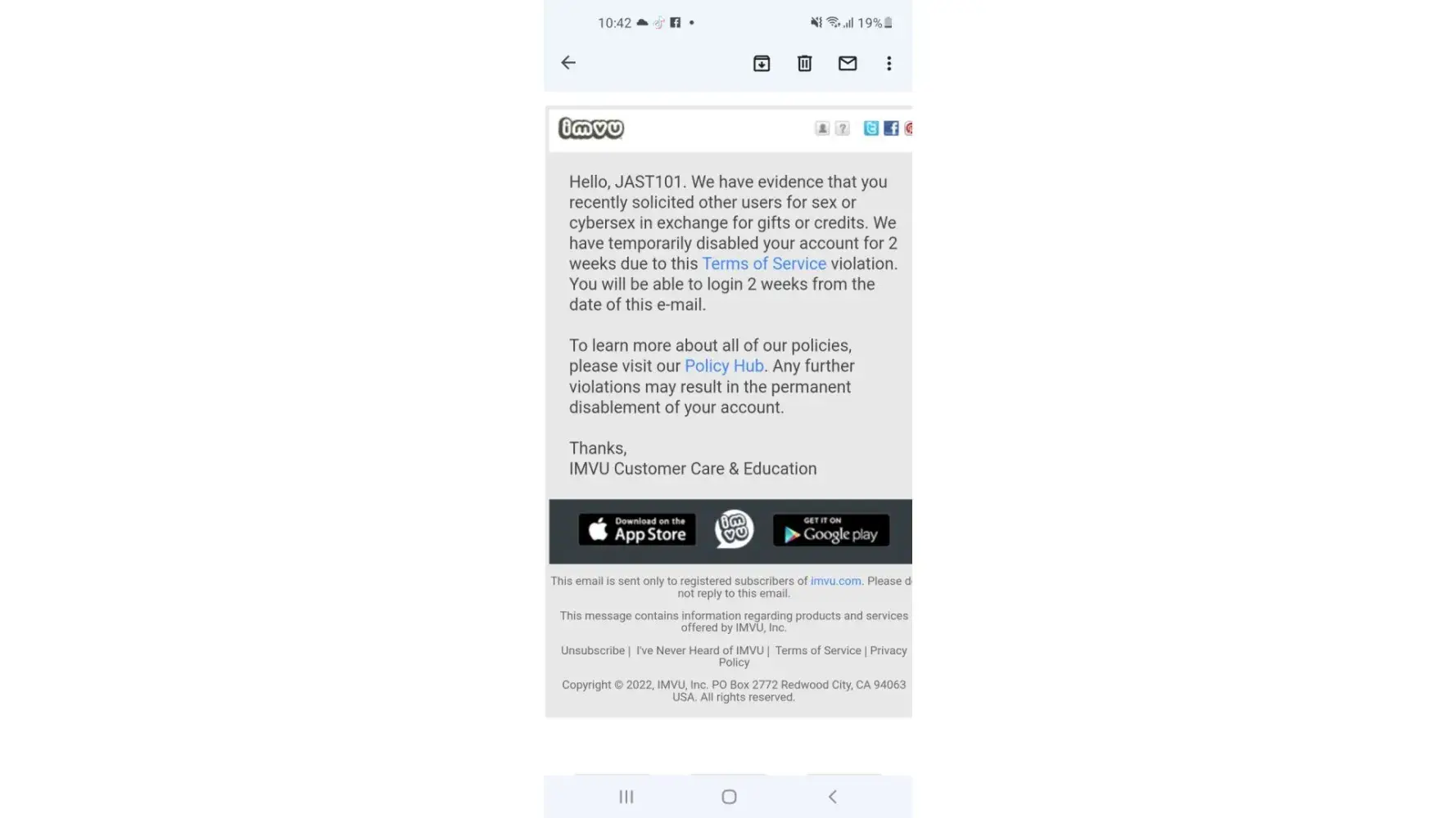 have had my imvu account for 15 years. LasciviousMel. I have bought AP. My age has been verified. I have spent so much money on my account as you can imagine...I was chilling in my room one day and we were on the topic of age. I typed. ‘I’m 33, but mentally I’m 12" and as we all know UK has banter. I was merely joking. I have never misrepresented myself as anything other than my age. 33. My account was banned. I contacted and explained my side of the story but they refuse to give me back my account. I explained that if I typed I’m 33, but mentally 80 that wouldn’t have been an issue right? I’m absolutely furious and explained it was just a joke. I don’t see myself as a child nor act like one online. They’re refusing to listen or understand and the customer service I’ve received is appalling. The levels of stress and anxiety I am experiencing from this is ridiculous. I have witnessed through my 15 years people going out of there way to create an account to harras people yet I'm the only who's banned due to a light joke about being young at heart. Where's the empathy and loyalty that I've shown you IMVU?