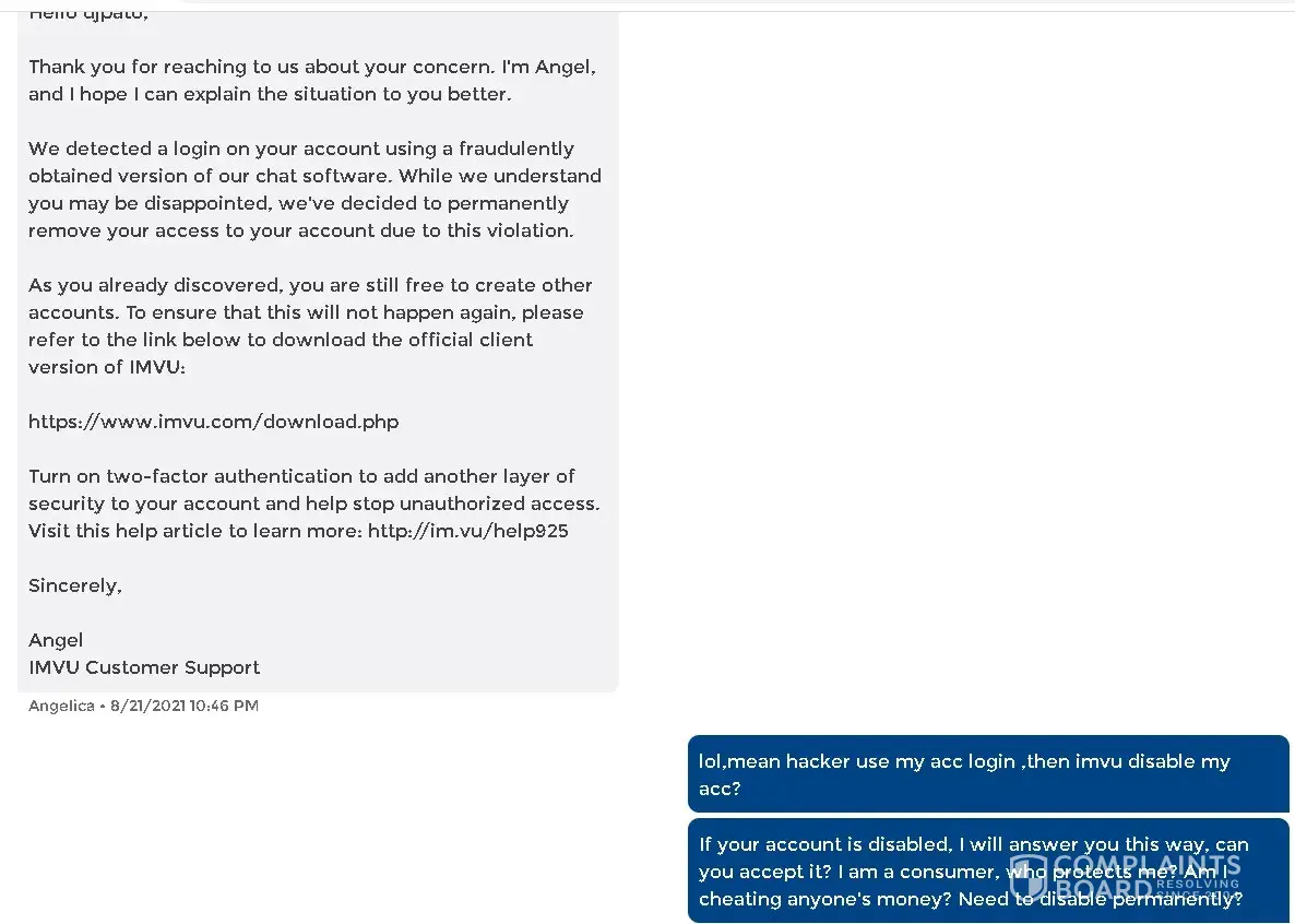 I've been an imvu player for 3yrs and my account is very expensive due to spending alot my money on credit and also I was vip and ap, then on february my account just got banned and other account too the ground said on email was I am attempting of selling credit i'm asking where is the proof that I sell credit and other account that got banned due to selling credit but they didn't sell any credit nor did i, because first I know it's illegal to sell credit and I was being careful not to make my account got banned so, the imvu help desk that i'm talking to said maybe someone gift me with illegal credit, then so why am I banned you should banned the person when gift me using illegal credit not me many of us are victims here because some imvu player gifting us using illegal credit then so why do you banned my account accusing I sell credit? Where is the fair justice here my account cost too much money I was shocked I was accusing by attempt of sell credit this is not good most of my friends also got banned because they where accused of selling credit? Which is they don't so why we have been banned for not doing so that accusations? I will not complaint if I do that's but i'm complaining because you banned a wrong person who don't sell credit there are people selling there credit who don't get banned so unfair! May account was angelicagarland09 kindly have all the investigation why is this going on imvu banning wrong account! Now how can you bring back my account that I spend too much money on that for years? Kindly have a thorough investigation on this part who are in charge of this banning wrong account must be kick out on his duty by doing this!