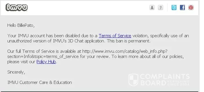 My account was banned for "unauthorized client use" after I'd logged into my official IMVU client after not getting on in 2 years. I am on the official IMVU client. I did nothing to break TOS.
