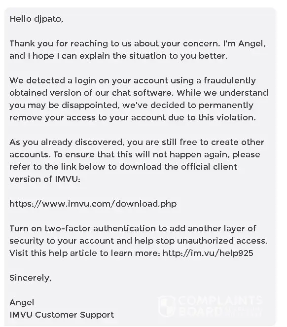 We detected a login on your account using a fraudulently obtained version of our chat software. While we understand you may be disappointed, we've decided to permanently remove your access to your account due to this violation.
