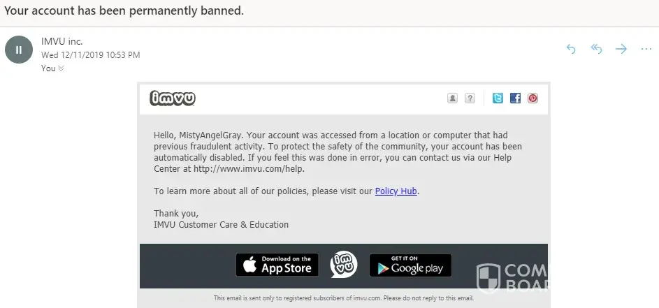 I've only had this account open for under 2 months. I used it for about 2 days before attempting to gain credits through an offer, when the credits haven't arrived I reported it and after 1 month I eventually got a email confirming I will receive my credits (this was from a 3rd party company that offered the credits on IMVU). I tried to log into my IMVU account and I found out it was disabled - with no prior notifications of this ever happening. When I enquired about it I was told that it was due to "fraudulent behavior" "going against their terms and conditions" and that "they can't give more details". However I have read the terms and conditions TWICE and I did nothing to break any, I didn't even need to read the terms and conditions as I have not even used this long enough to do anything wrong. Besides, I have also seen that many other people have complained about IMVU wrongfully accusing them of fraudulent behavior so sadly I'm not the first one.