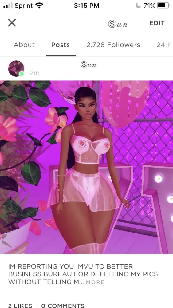 IMVU is discriminating against me by deleting my pictures that do not violate their Community Guidelines. I don't know what person is responsible for deleting my photos but so far, they have deleted about 8 of the same photo - all within an hour. I spend a lot of time and money on this platform and I expect to be treated the same as everyone else. During this crucial time of social distancing and isolation, I expect much more from this virtual gaming space. I will be going to Second Life and spend my time and money there.