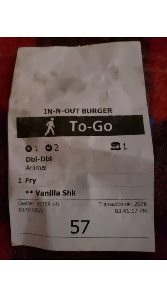 Today I go to buy 4 burgers and uno of those whas over cooked the bread heas burned and the coke just have the taste like water the fries taste like cardboard I never I am going back to buy again I whas hoping that whas great because I see the all the time full the line to take out. Trans 4147 in n out woodland hills [protected] cashier Lassete me check 34