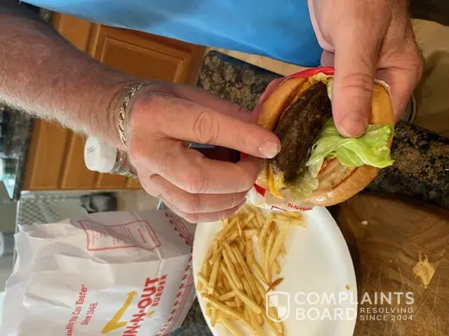 My wife and I ordered a cheeseburger with lettuce, sauce and grilled onions. Worse burger ever. Burger tasted burned and texture of cardboard. We love in and out and immediately notice a problem with taste and texture. Ordered on 7/26/20 at about 6 PM. Never had an in and out that tasted so bad! We both threw most of Burt in trash. Robert Silvia, Laguna Woods, CA [protected]@aol.com [protected]