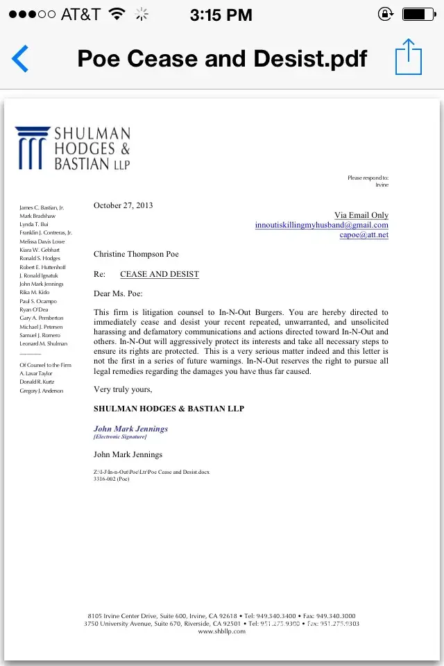 In-N-Out Burger has resorted to corporate BULLYING! I have been telling everyone my husbands story and what In-N-Out Burger has and is doing to him. I have ONLY stated TRUE facts. Facts that I can back up with emails, Governament/City agency letters and other paperwork. Im response In-N-Out Burger has had Attorney John Mark Jennings a Partner at Shulman Hudges & Bastian LLP. [protected]@shllp.com send me a Cease & Desist Letter. The letter is THREATENING to sue me for "repeated, unwarrented, and unsolicited harrassing and defamatory communications and actions directed toward In-N-Out". How can I be doing any of that by telling people the TRUTH? They just don't want me to tell the truth anymore! I will continue telling the truth. A Cease & Desist means nothing when your telling the truth and have the PROOF!