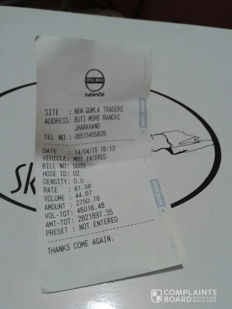 This is regarding an incident of April 14th 2015, Indian Oil Petrol Pump " New Gumla Traders Ranchi Jharkhand, presented a bill for 44.67 Ltrs when the fuel tank capacity of my Swift LX 2010 model car is 42 Ltrs. I asked them to full the tank completely, i already had Approximately 7-8 Ltrs of Petrol, post filling the tank they presented a bill for 44.67 liters. Which is not at all possible.