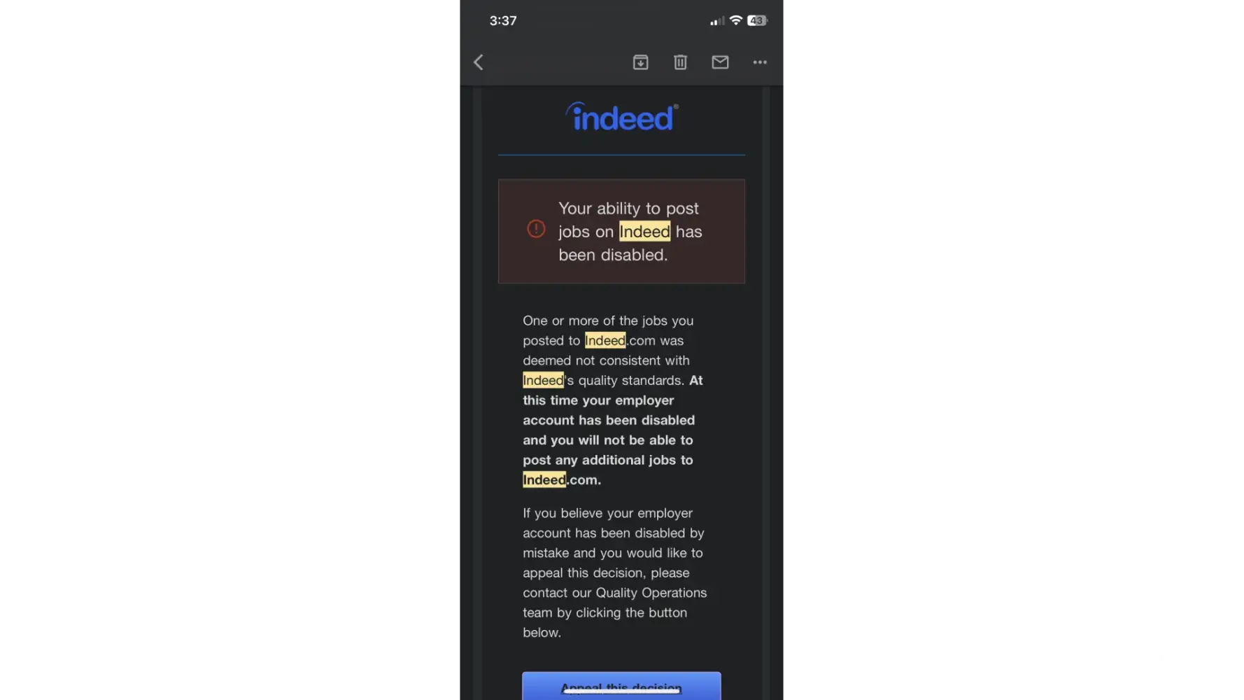 Just yesterday, I received an email saying that my account had been disabled with no explanation. I tried to appeal the decision, but all I got was a vague response saying that my account was "suitable for Indeed." I followed all of their instructions and tried to communicate with their quality control team, but I got no response. I even tried to contact my account manager, but she didn't get back to me either.
