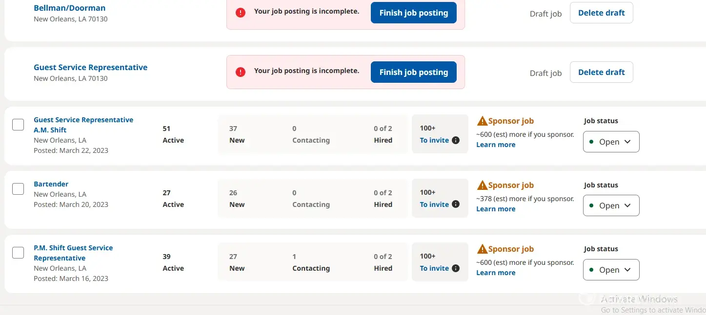 I was charged $196.00 for "free" posting. I told them to cancel "everything" the day I got this bill on 02/28. I did not want anything to do with them again. I was crystal clear. I closed the posting for the position. Here we are a month later and I get a $65.00 charge for marketing? Why would I have marketing for a closed position. Everything on this site is setup to f^ck the customer. You cannot delete your credit card information. There is no easy, clear and concise way to cancel your job posting. Even after you email them, which by the way takes at least 24 hours for a response. You have to close the job add. Good lucking figuring it out. I had to go to the internet and youtube how to cancel indeed to stop charges. Then I still got more charges after I closed the add! Fu! The free posting is closed! Why would I want to pay for marketing for a closed add? This company charges you for "clickbait". How? When people apply for a job you get charged? Nevermind people that clearly aren't qualified apply! Thus clickbait! I would never ever use the people for anything! I would rather use craigslist... It's sad to say but I trust craigslist more than these deceitful people.