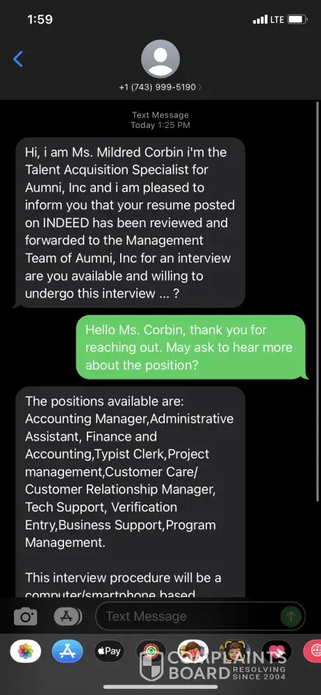 Was contacted by a Ms. Mildred Corbin stating she is a Talent Acquisition for Aumni Inc and that she saw my resume on Indeed.Com and it was forwarded to their Management team at Aumni Inc, then I received a message on WhatsApp from a Ivan Fanucci stating he was the Interview Manager, he asked me typical interview questions about my previous work and then listed the different software's that are out there if I knew how to use them one being QuickBooks. They then waited one day and offered me the position of Remote Administrative Assistant, they then proceeded to send me the front and back copy of a Cashiers Check for $2, 300 and asked me to deposit it into my checking account through my Mobile account. They even talked about medical, dental plans, even paperwork for a background check! They were very professional until they sent me the check for Office Supplies. What a very disappointing world we live in nowadays!