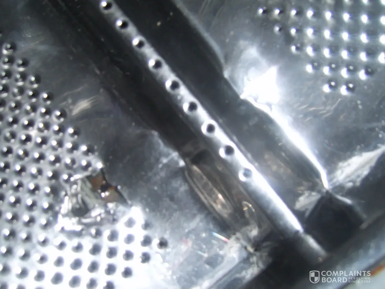 Bearing this in mind, I still went ahead and purchase a washer dryer - WDG1295W. Today I came home from work after leaving some white clothes to wash in the morning. Upon removing the clothes from the machine I noticed that there was black spots all over them. Once I remove the clothes from the machine, to my dismay, I noticed a large hole in the drum and a small hole in the outer drum. I removed the back panel and noticed a small screw on the floor.