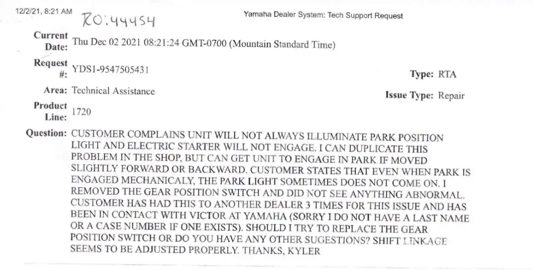 I've been working with Victor at Yamaha Customer Support. Victor has not been helpful. After 5 trips to 2 different dealers to fix this issue, I requested a replacement ATV at no cost to me. We almost had a deal worked out, but he wanted $800 for the trade which is not fair to me as I've been trying to get this fixed since August 2021, without countless trips to the dealer and gas to/from Grand Junction. Once I refused to pay the $800, Victor took back the deal and told me to take it back to the dealer again.