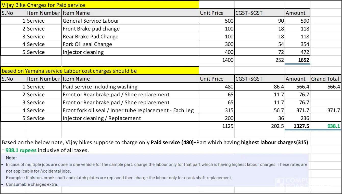 10. labor charges or not as per Yamaha labor cost defined in Yamaha website, if in service they 10 parts even minor or major. they put 10 labor costs for each part, other than that ask for general service.