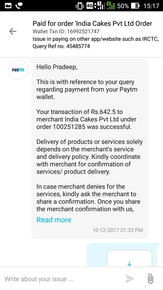 I wrote several times to Paytm but they are not interested in solving the query. Even merchant is not helping and replying properly.