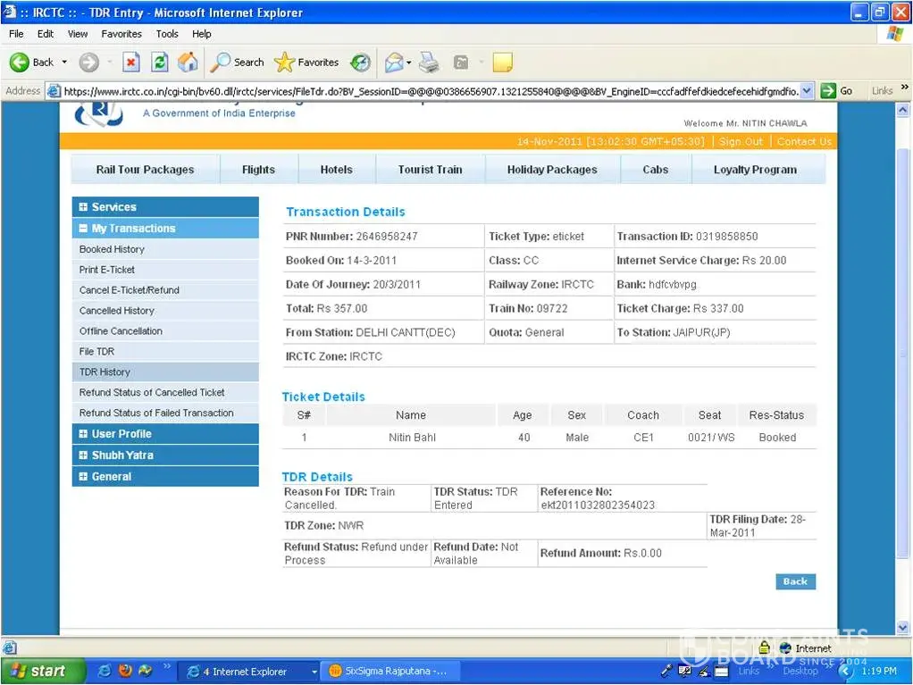 Indian Railway Catering and Tourism Corporation [IRCTC] TDR Refund