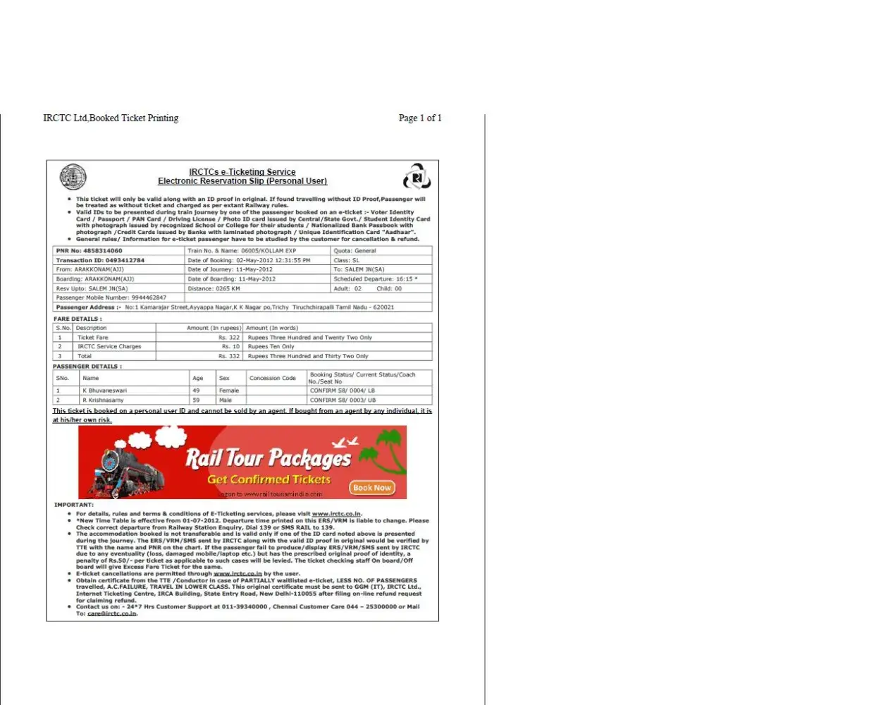 I Had booked the train ticket for my parents thru online IRCTC from arakkonam to salem.