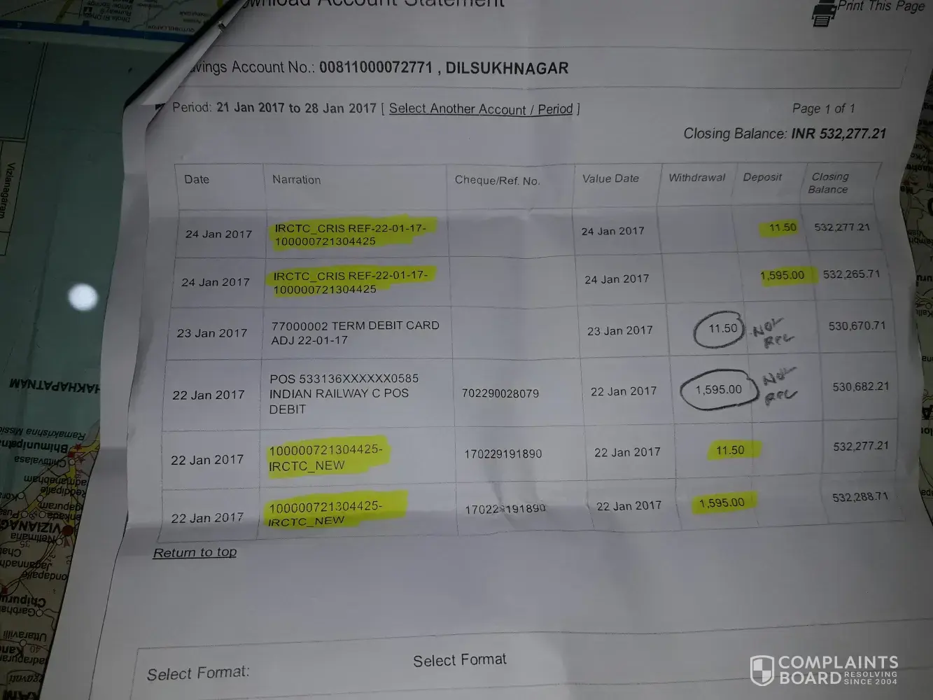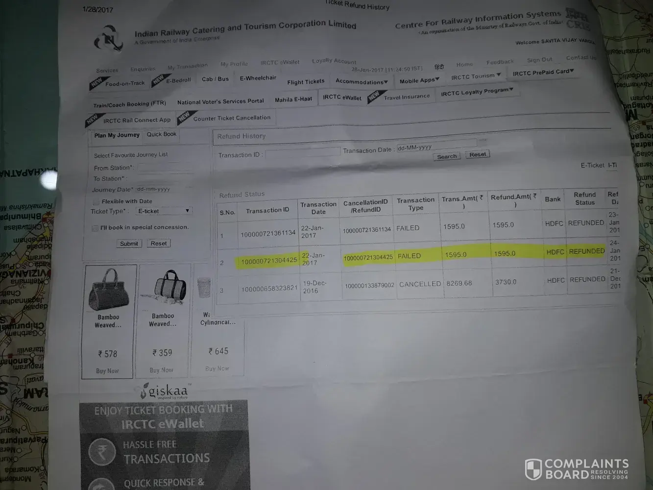I booked a train ticket from kota jn to kacheguda hyd on 22/01/2017 twice but both the times the transaction has failed, but an amount of rs.1595 got deducted twice from my bank account ietotal rs.3190 in total of this i have recieved back rs.1595 in my bank account but one more amr pf rs.1595 with transaction id no .[protected] which was refunded by irctc on 23/01/2017 tobhdfc bank is notvreflecting in my bànk acconts.Here by i am attaching photo of irctc refunded date details and my bank account statement from 22/01/2017 to 30/01/2017. as proof of amt not recieved.The tranaction id i have mentioned was done using hdfc debit card no ending 0585.but till now after 7 days also i have notvrec the amt of rs.1595.kindly do the needful.