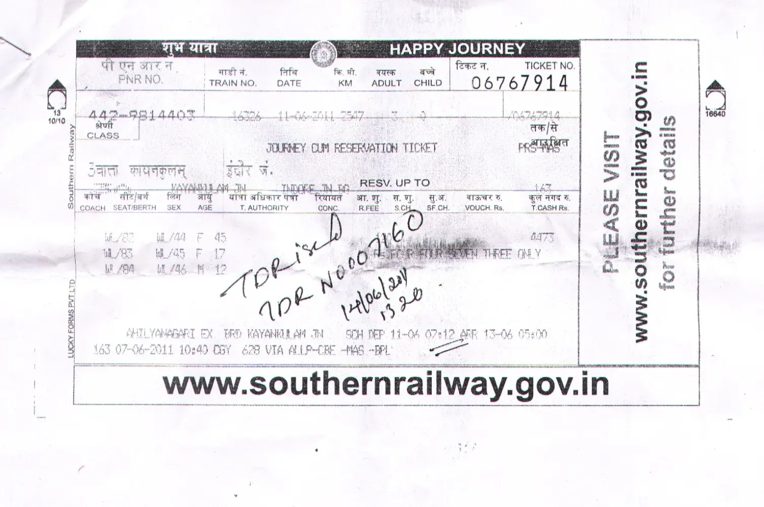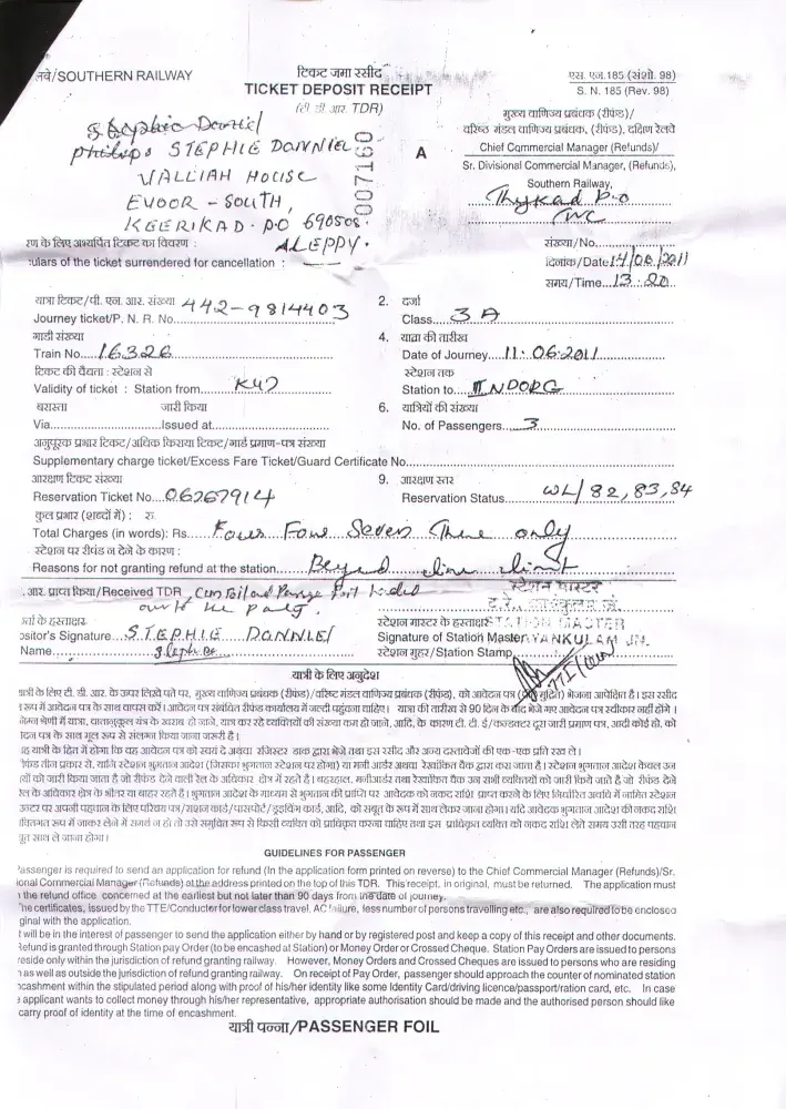 My family booked a Waiting List ticket with PNR number [protected] starting from Kayamkulam- Indore in train number 16326 on 11/06/2011 in 3A class for the amount 4473.00 for 3 passengers (my wife and children). On the same day at 09:00hrs, as we are in Trivandrum, we forwarded the ticket in Trivandrum, pattom LIC building railway counter for refund, they informed that the lodging station is Kayamkulam and the train is already started journey they are unable to refund the ticket money. Next day I forwarded it to Kayamkulam station and office informed that the train already started journey so refund is possible only from divisional office Trivandrum. I forwarded for refund at Trivandrum Divisional office on 14/06/2011 with a TDR no.SN 185. Till now no information about the refund.