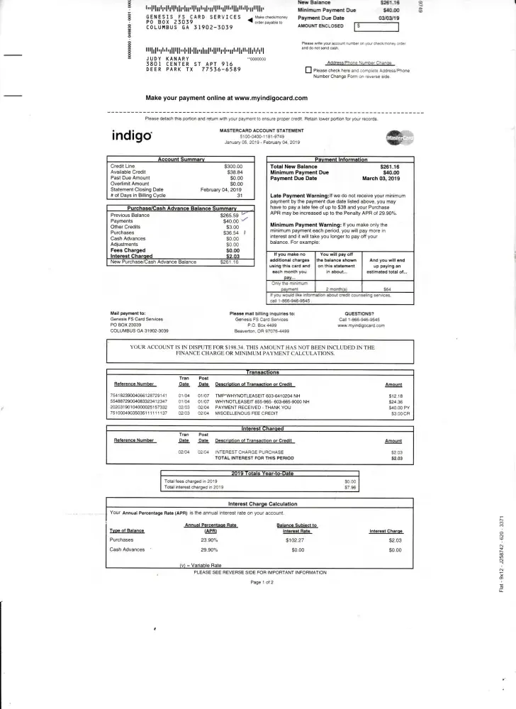 I had an Indigo account. In 2020 I started receiving fraudulent charges from Google. I contacted Genesis FS card services regarding these fraudulent charges. My card was cancelled and a new card issued. While the charges were being investigated I was still forced to pay interest and payments for these charges and incurred late fees and overlimit fees as well. When the investigation was over Google had refunded all the charges but they were not all applied to my card balance and the payments I had made were not credited on my account for those charges . I went through this process 2 more times until I finally got tired of arguing with them because nobody I spoke to understands English and could not understand what I was trying to explain. They tried to say I had a balance of 600.00 to pay on the account. This is absolutely impossible because I had not even used the card for purchases. Going back from the time I opened the account if you removed all the charges from Google, the late fees and overdraft fees along with the interest for the Google charges, and then take all the payments I have made it would come out that they owed me money not me owing them 600 more dollars. After I threatened to contact the attorney general's office they then made it where I could not get any of my billing statements online and they said since the account is closed they do not keep those records anymore. I know this is illegal. They have broken their own terms and agreement in how fraudulent charges are handled. Google has refunded all the money for the charges but that was never applied to my account when Indigo was making me pay for them while they investigated. Now they refuse to even give me the 80.00 credit where I overpaid the balance.