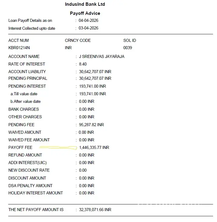 Dear Sir Madam, IndusInd Bank has provided a Foreclosure letter(attached) received has been levied with 4% fee which is not acceptable. I would like to clarify as per the RBI guidelines, there will be no fees for Individuals and also, I am paying off from my own account. And the loan sanctioned was for my personal and private home improvements and...