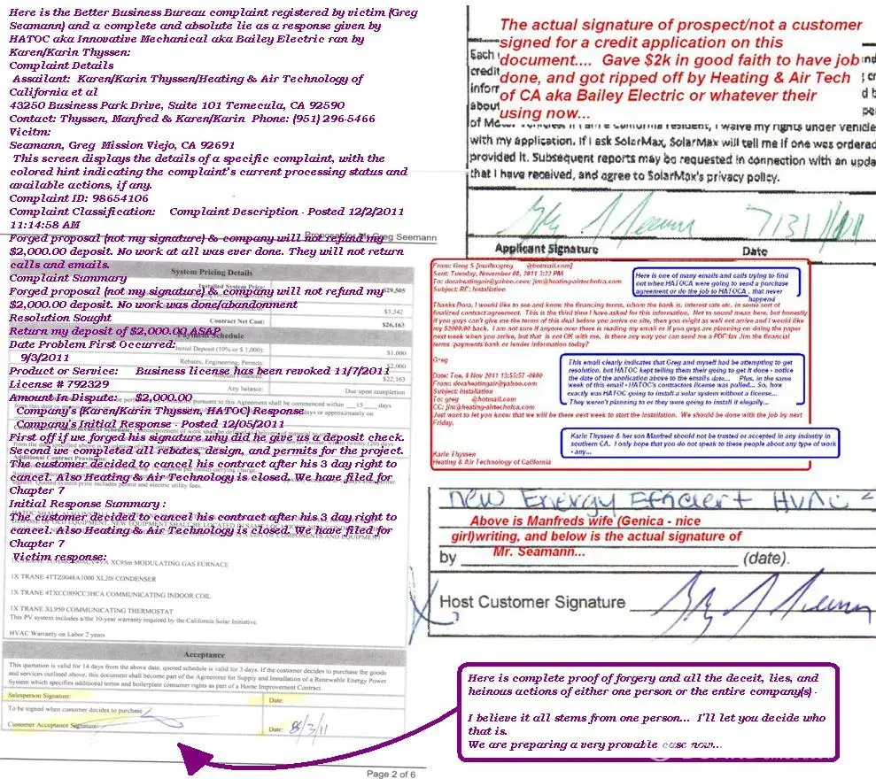 ?Contact me at [protected] or leave an email address and I will give you even more proof that this so called company continues to fraud, swindle, and scam homeowners and commercial property owners to this very day. They NOW are possibly going by the swindling name of Bailey Electric. This company takes your money by bullying its victims. I'm talking with the North County Times, O.C. Register, and The L.A. Times right now in developing a huge story regarding these creatures heinous and disgusting actions - sad...