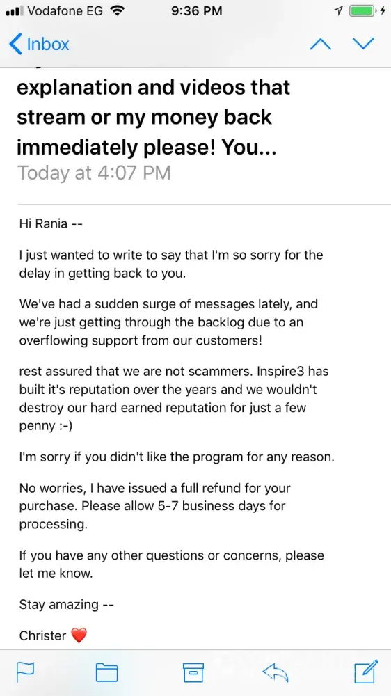 My experience with InSpire3 is that they have responded within a few days to my emails relating to software questions or unsubscribe from their email list. Because of their quick responses in these incidences I am certain that they are not willing to honor their money back guarantee.