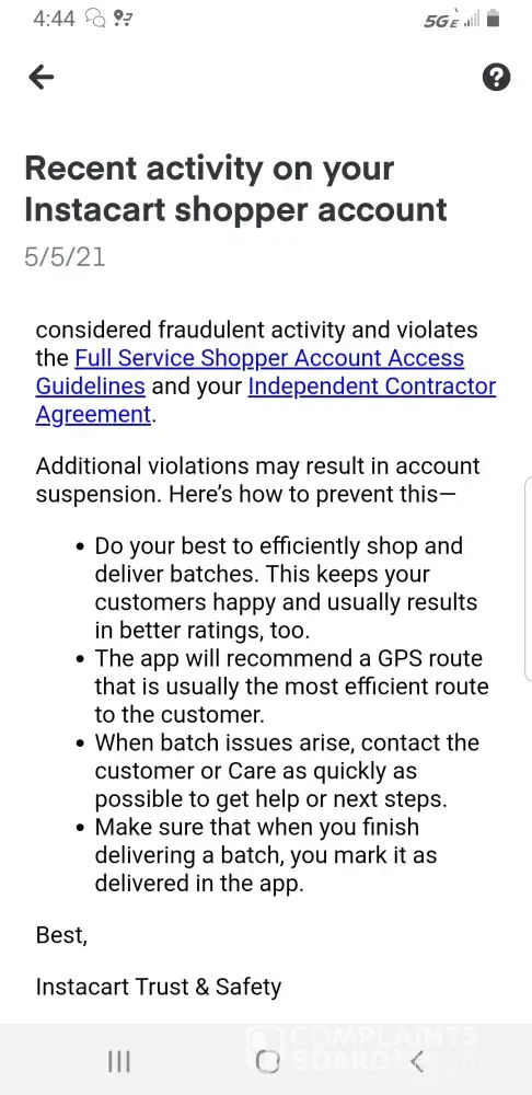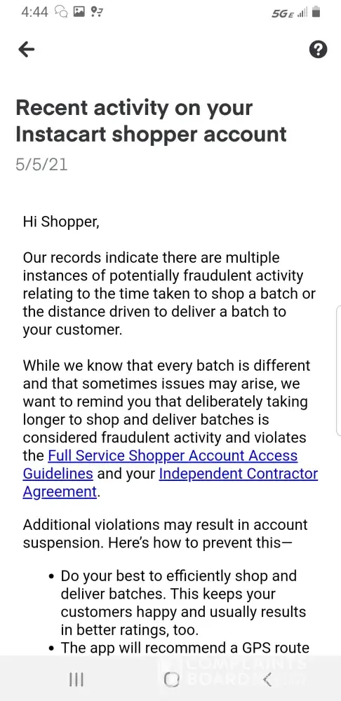 Instacart has sent me a notice that I participated in multiple instances of potentially fraudulent behavior on the platform. In its message, it provides no details or dates, it just states that I have purposefully worked too slowly and have purposefully taken slower routes just to make the time go more slowly i.e. make more money because of Prop 22 in California. I am a 5-Star Shopper, have been on the platform for a couple months, and have no idea what instance they're referring to. As a 1099 worker, I have the choice to do my work as I see fit, as long as I don't break any major rules. This is a false and baseless accusation, and it also came with a threat of deactivation if further violations occur. Yet they give no evidence and don't give me any chance to defend myself. This is wrong on multiple levels. I do my work in the most efficient and timely manner that I am able to do, and have never recieved a bad rating or a notice of excessive lateness. This is absurd and very scary as it is my livelihood.