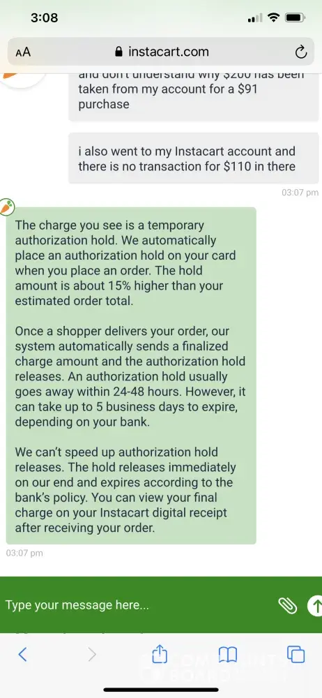 So let me get this straight Instacart can place a "hold" for more than the total amount they say they are going to charge. Mind you, I requested a refund for all out of stock items and requested that no substitutions be made so how can they justify double charging me!? So how can they get away with borrowing extra money from your bank account? This is stealing! I'm calling BBB and a lawyer.