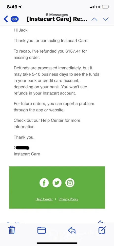 I have since emailed Instacart six times & still have not received any communication back from them. I sent a copy of the receipt, the picture of the customers house along with the route I took to get there on my google maps, & also a picture of the delivery was sent through the Instacart app.
