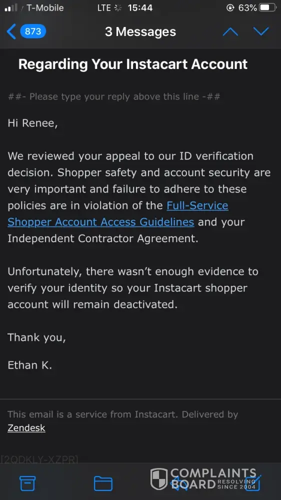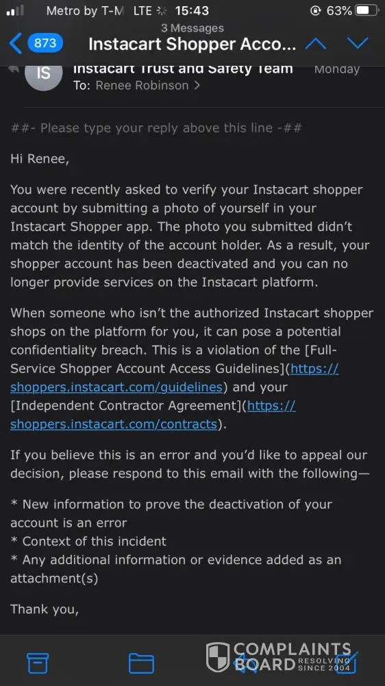 Instacart requested a photo to prove I am who I am doing the Instacart shopping. I took a picture of my ceiling in my car because my hair is in an Afro not done. Instacart fires me. Then I sent an email with my face, hair messed up, all my personal information and the person responded From Instacart stating I still did NOT prove I was who I said I was. Most importantly my account is Uneligibe for rehire