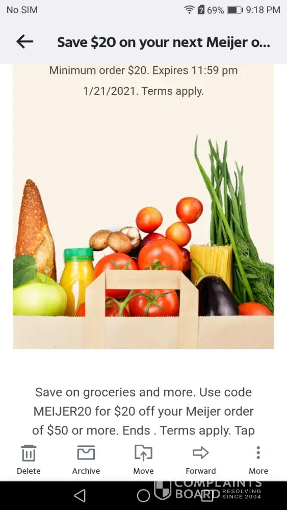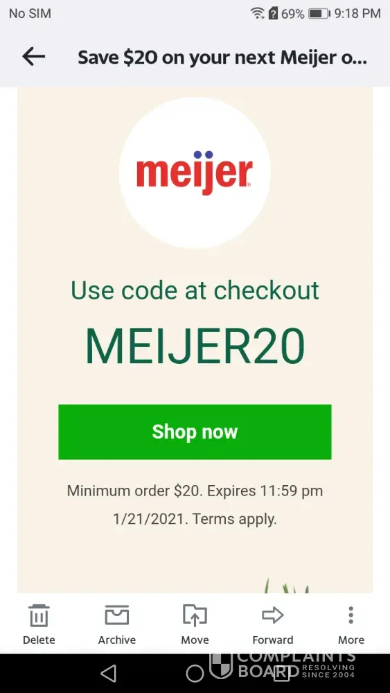 The email coupon contradicts itself between minimum $20 and $50 dollars in purchases.. And the code for meijer meijer 20 doesn't work on the app... It states it must be your first order when the email states next order. If your not going to accept the $20 discount then dont offer it and please make sure the email states the correct minimum amount of purchase. I tried both $20 and $50 and neither would accept the coupon/discount.