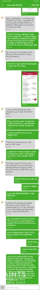 I reached out to chat support. They did not help me. They proceeded to tell me I was not charged any more than 239.12 which is a lie. I asked for a supervisor. The guy said 34 to 40 min wait. He said he could schedule a call for 8 am. I said i'll wait, please transfer me. He ended chat. I received no call 8 am. I went on to chat again. The guy told me the same story even after I said supervisor please. He scheduled a call for in an hour. My anxiety is through the roof, because my husband needs his medication tomorrow. I have 7 kids. And now they're saying 5 to 10 business days for my money to be released. I am not able to wait for withdrawals and suppose to work while my husband is having painful withdrawals. I told the supervisor off because he told me the same thing the other guys told me. I was not overcharged I have to wait 5 to 10 business days and too bad for my family stress anxiety attack and inconvenience to say the least. His solution was to chastise me for "yelling" at him. I interrupted him because he is lying. I have the bank statement reflecting 91 in the hole. I had 500 before my shopping and now i'm 91 in the hole and my purchase was 239! I said so that is how you fix the problem? He hung up on me like the first chat service agent ended my chat and none of them helped me even though this is now a medical emergency for me and my husband. This is not right. I have made 5 purchases through instacart and most of them have resulted in over charging double charging and stress on my end. I asked how to complain to the office of the president. The supervisor has a thick accent and all I could hear was visa... And he hung up on me. So what am I supposed to do? Who deals with my husband's painful withdrawals because you stole his medication money. This is the worst business I have ever had to deal with. During a time of pandemic when people can't just go to hospitals and I am raising kids you guys really screwed me over. I received no comfort no help and was left with a panic attack. I will be looking in the lawsuit.