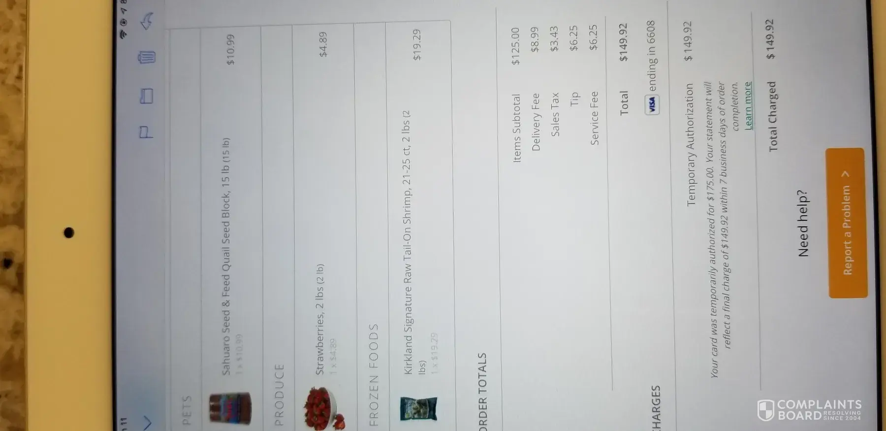 I don't usually have to wait this long, and they get me the food from the markets close to where I live, so I don't have to wait this long. This is inexcusable, and I hope it doesn't happen again.