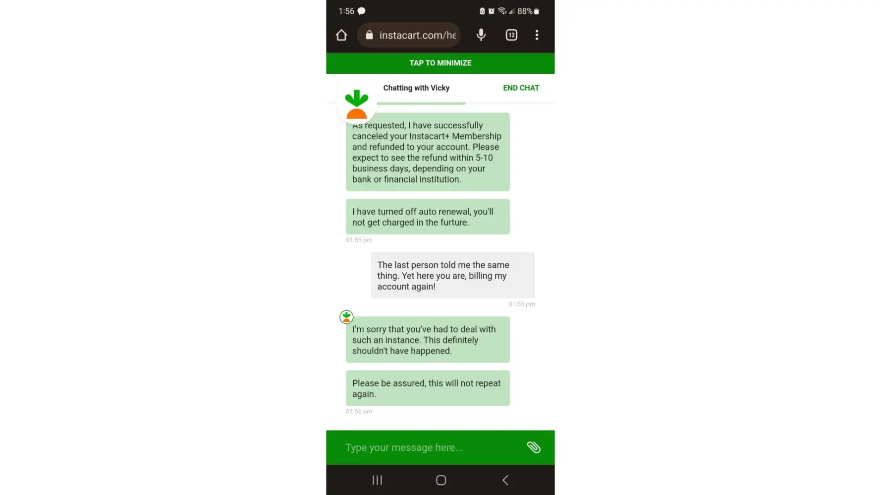 Check your bank account for the refunds! They have stolen over $100 dollars from my mother, instacart reps always say they will refund the money but they never do! I am currently working on submitting my own complaint! It is outrageous how they don’t support they consumer that make their company run. 98% MALE shoppers buy about to expire veggies ( if they pick the right one) and they usually opt for REFUND rather than look for the item for a replacement. INSTACART needs to acknowledge the consumers complaints.