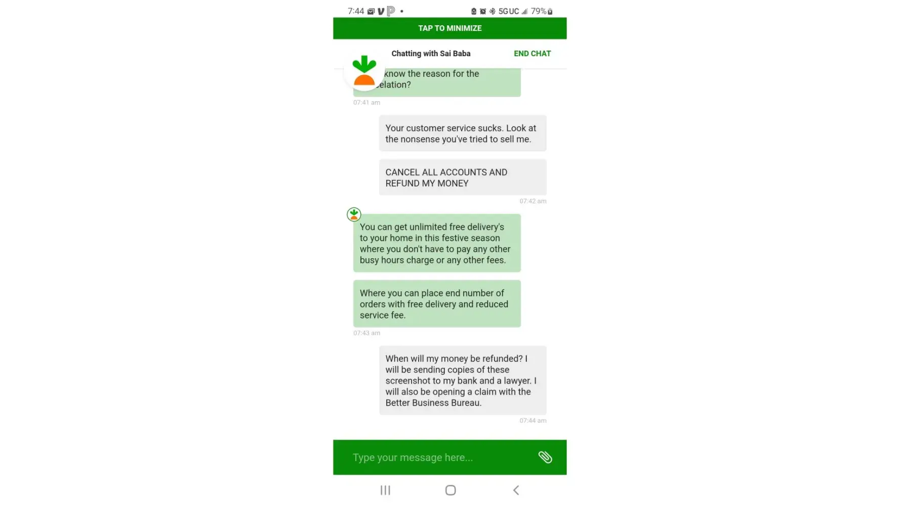 I ordered groceries at 12 pm today from a store that is only 1.5 miles from my place. I am sick and could not leave home but was heavily relying on this delivery service. After 3.5 hours they told me my shopper who was 80% done collecting my items had a 'technical difficulty' and could not complete my order. I called and insisted to speak to the supervisor who told me the VERY BEST They could do for me is give me 7$ back (my order was 135$) and ensure my order would arrive by 7pm (which was 2 hours after the allotted delivery time) -- even though they guarantee a refund or credit if your order is late. Unacceptable and extremely unprofessional, dishonest behavior... But that isnt the worst of it. At 6:45 pm I received a text that my order was cancelled. No explanation... no options for resolution... just nothing. After waiting 7 hours, talking to the supervisor, being promised my failed order would come at a certain time, it was just cancelled. When I tried to call and speak to the supervisor again, they wouldn't let me. So, they took my money and then performed zero service, wasted my entire day, and just didn't give a [censored] when I tried to voice how unacceptable this was. This is hands down the worst company I have ever ordered from. Please save your peace of mind and time and money and stay the F*** away from this company