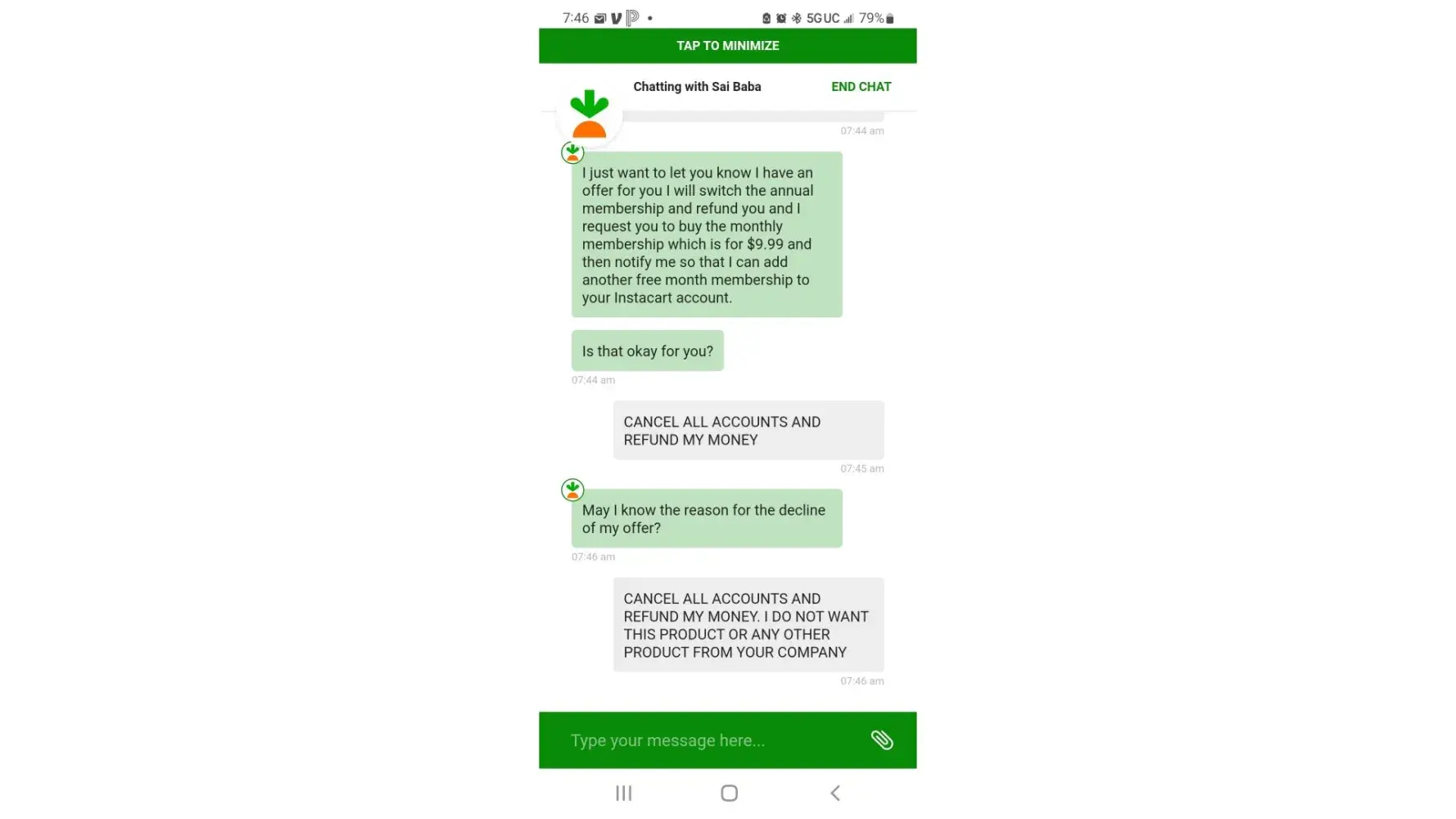 Today, I was billed by Instacart yet again. I had to contact them for the third time to cancel my account. I have screenshots of this conversation as well.