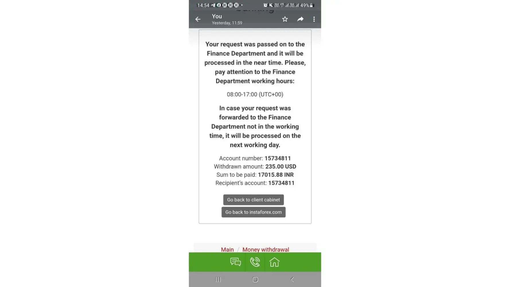 [protected] gave 235 $ withdraw. I have complained many times. Will my money come to my bank account [protected] or my instaforex [protected] 28.02.2022 I have been asking for the last two weeks that the money given by withdrawl on 235 $ did not reach my account. What are you thinking? If my money is late I have to compensate for it. What management are you doing