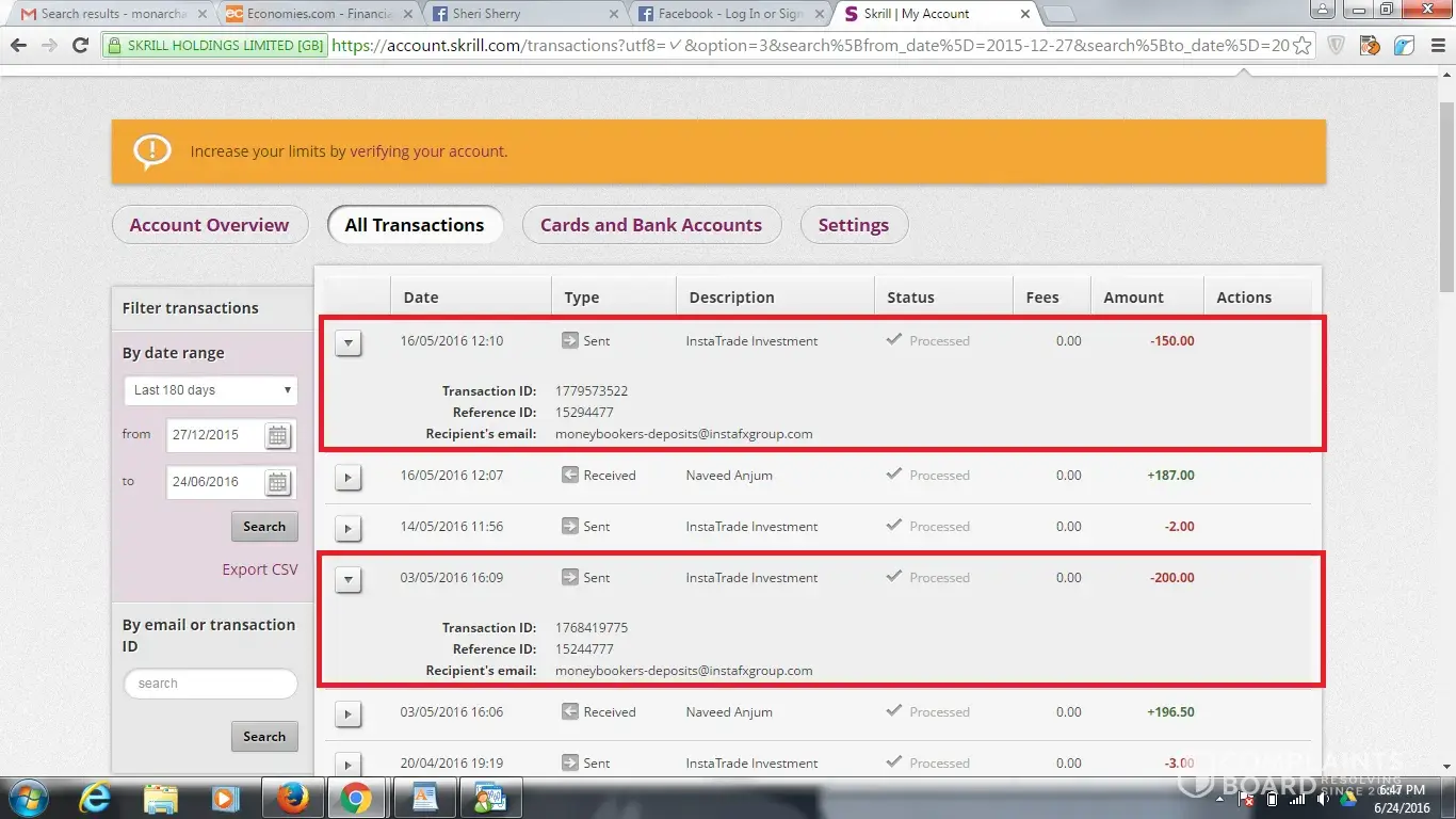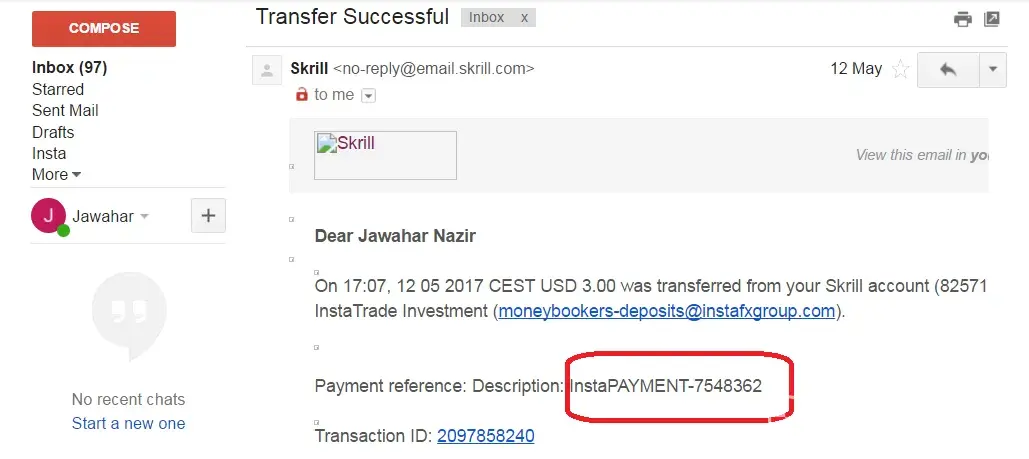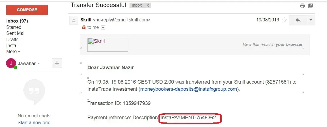 Hello dear I am tariq aziz I deposit from my skrill account to my instaforex account no [protected] my transaction i'd [protected] received in my email skrill help line costumer told me i'd [protected] Please checked my transfer 52 us dollars why not received in my instaforex account no [protected] Bellow attached from skrill received email please help...