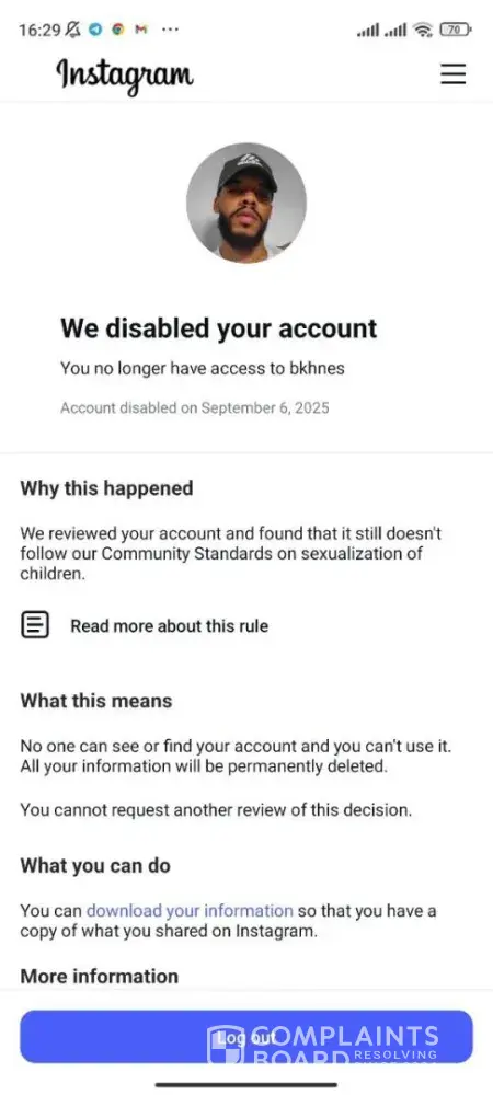 Instagram account with the username @aslankaos was disabled on September 14, 2025, under the justification of “account integrity,” even though I did not violate any rules. Despite being a real person, my access was terminated directly without being given any opportunity for identity verification or additional review. I was conducting my commercial...