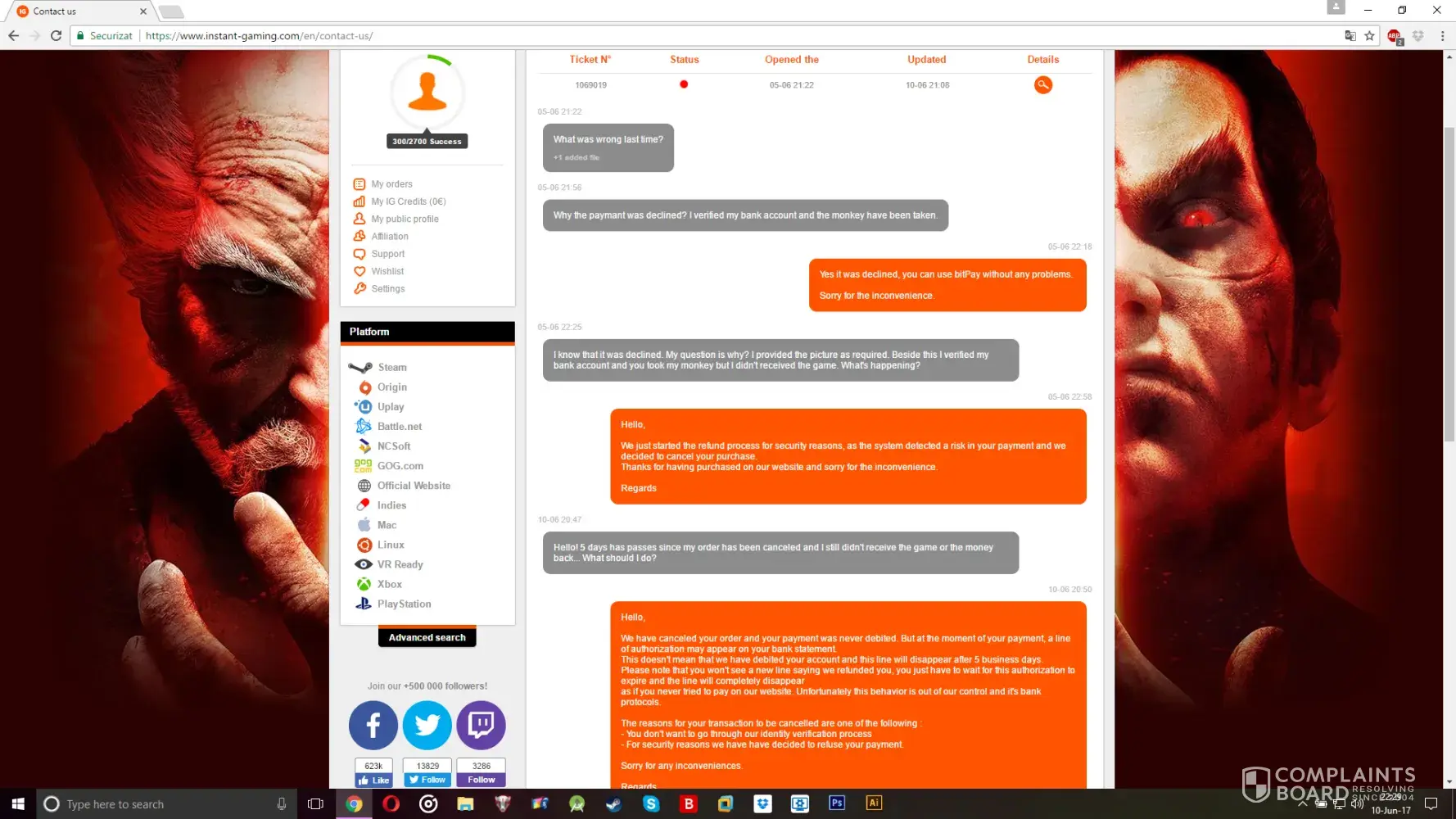 I bought football game from the website www.instant-gaming.com. The seller mentioned on the website that within 30 days I could return the order and get money back, but it was big scam. I tried to return my order, coz the game wasn’t what I wanted, but the seller refused. He never explained why, he simply stopped to communicate with me. They are liars and scammers, and I want to find other deceived customers, who lost money. Please we need to stop this company and return our money. Post your comments.