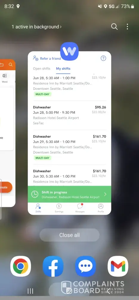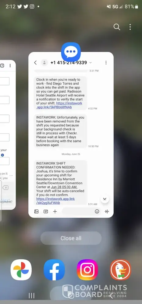 1) At 3:30AM on the day of my first scheduled shift, Instawork sent me a text saying that the shift was cancelled. THEN, my account was closed for a NO SHOW. I filed a complaint and was reinstated but it still shows that I had a NO SHOW. A no Show means I am not eligible to accrue points which affects the amount of pay I’m eligible for.