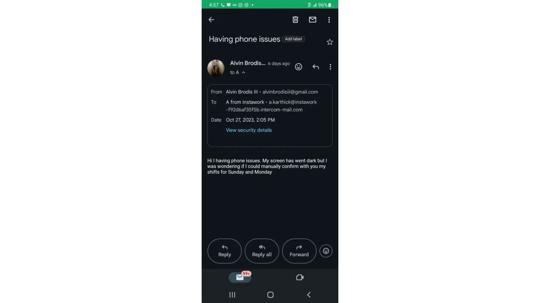 Hi. My complaint is as follows.. On October 26th 2023 at 3:15pm while getting off from a gig my phone screen totally blacked out and I could nolonger see my screen. I had to get the business (Hilton Garden inn North airport) to clock me and out in order to complete the gig. The next following day I sent instawork an email through the use of my tablet...